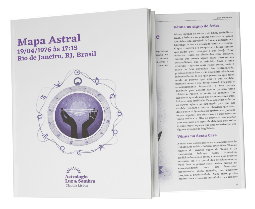 Você vai receber esse poderoso Mapa Astral personalizado com as interpretações da Cláudia Lisboa. Um verdadeiro documento de respostas sobre quem você é! Caso já tenha o seu mapa, você pode presentear um pessoa querida com essa ferramenta.