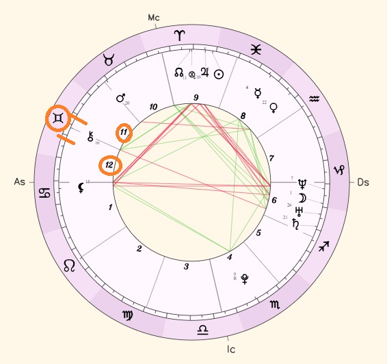 - Procure o símbolo do signo de Gêmeos no seu mapa natal e veja em qual casa astrológica ele está. No mapa natal de exemplo abaixo, Gêmeos está nas casas 12 e 11: