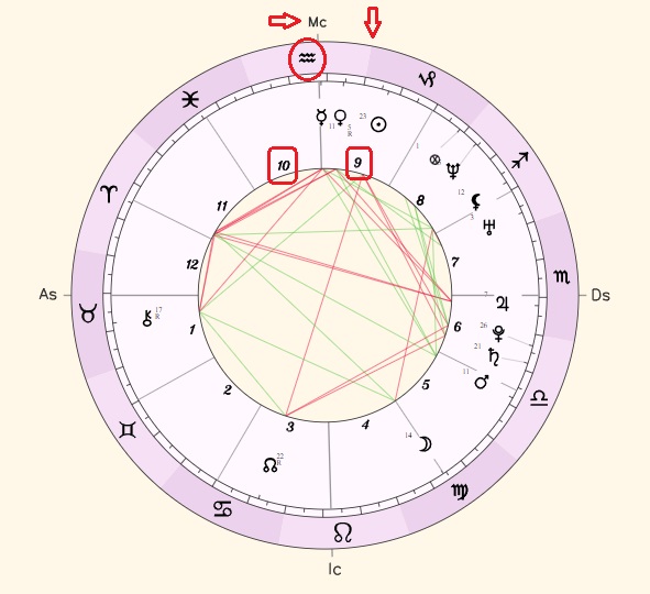 - Procure no seu mapa o símbolo do signo de Aquário. Depois, veja em qual casa esse signo está. No exemplo abaixo, Aquário começa na casa 9 e também está na ponta da Casa 10 (Meio do Céu – MC) do mapa astral: