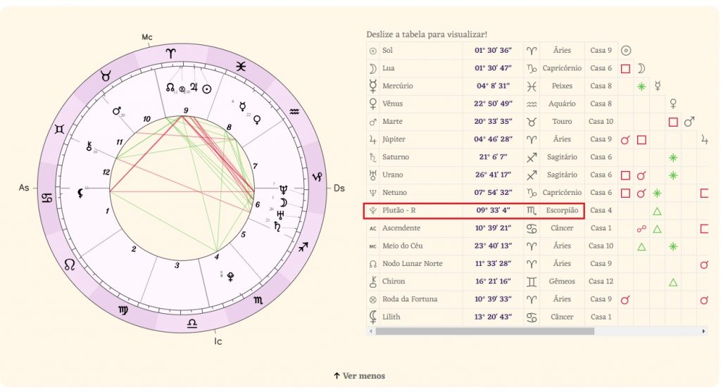 - Procure no seu mapa o símbolo do signo de Escorpião. Depois, veja quais planetas e pontos astrológicos estão presentes. No exemplo abaixo, a pessoa tem Plutão no signo de Escorpião: