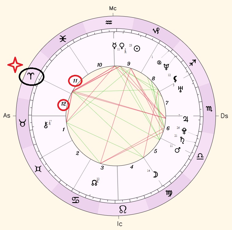 - Então, procure no seu mapa o símbolo de Áries e veja em qual casa (ou casas) esse signo está. No exemplo abaixo, Áries está nas casas 11 e 12 do mapa natal.