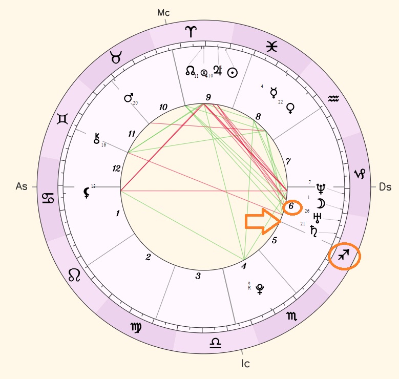 Você pode consultar o signo que está na ponta dessa casa com o Mapa Astral Grátis. No exemplo do mapa abaixo, a pessoa tem o signo de Sagitário na ponta da Casa 6: